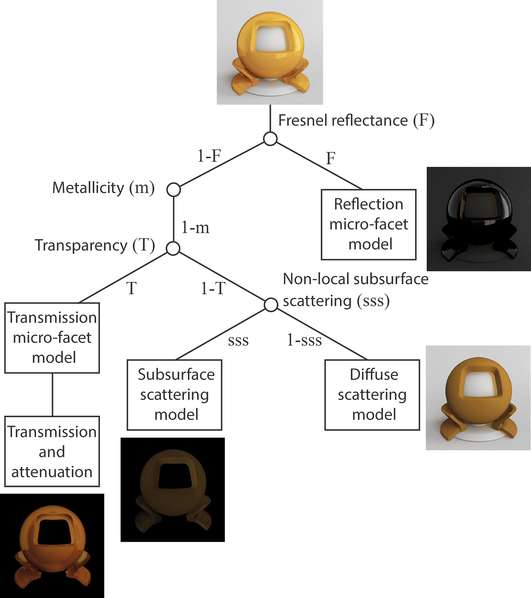 In a shading model, the energy must be properly balanced and conserved, in order for it to be physically correct, or "principled". The BSDF of the model is usually analyzed further into sub-components, each one corresponding to a specific type and stage of light scattering. Let us use the following energy distribution tree as an example of a simplified principled model to explain this.