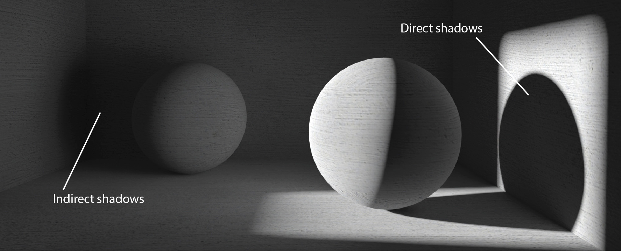 Surfaces not directly lit by a light-emitting surface are not in complete darkness, since light scatters on or through surfaces and indirectly illuminates other parts that do not have a direct access to the provided energy. Visibility determination is obviously important in secondary light bounces, since scattered light is also intercepted by the closest surfaces, causing indirect shadowing on other areas of the scene. If the obstructed light comes from a scattering event, i.e. after the emitted light first scatters on one or more surfaces, we consider the obstruction of light as indirect shadows.