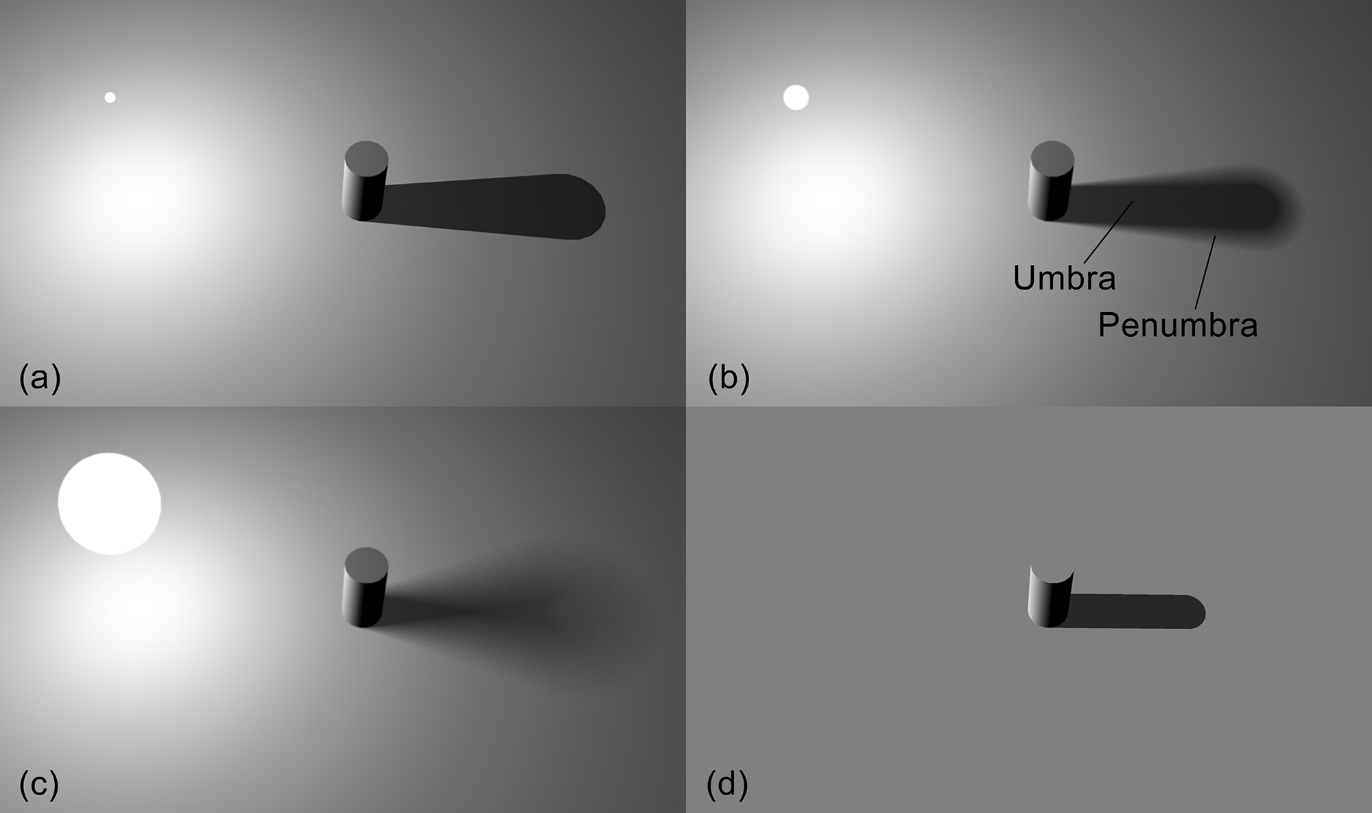 The exact shape of the shadow is influenced by the proximity of the light source to the shadow casters, as well as the size of the light emitter. A shadow consists of two zones, the umbra, which is the surface region, where light from any part of a particular light source is completely obstructed, and the penumbra, which is partially lit by the light-emitting source. In order for a surface to be partially in shadow, the light source needs to be of non-negligible volume4 compared to the size of the objects. To be more precise, as distance affects the apparent size of objects, the apparent projection of the light emitter on the surface needs to be non-negligible to create a penumbra. The shadows that are caused by non-infinitesimal light sources and have both an umbra and a penumbra are called soft shadows. Hard shadows only consist of an umbra and are caused by punctual light sources, or too small ones to have a perceptible penumbra.