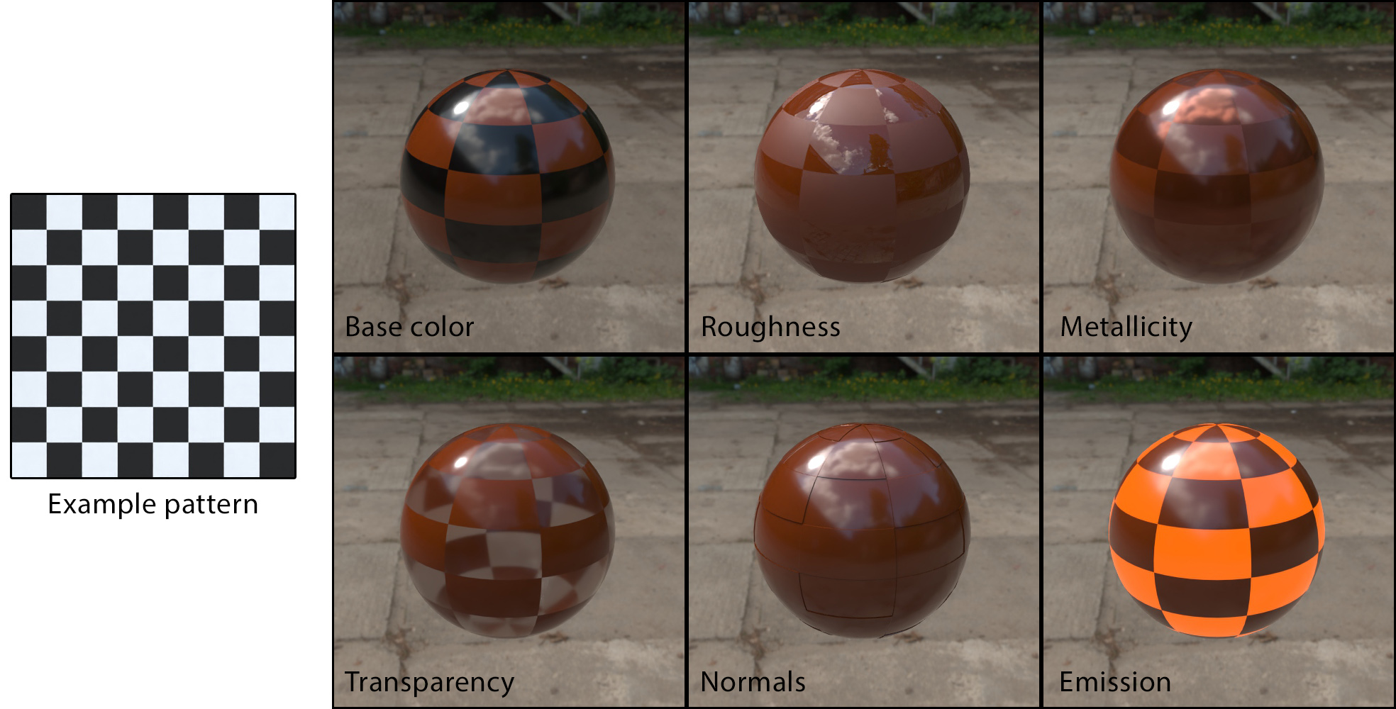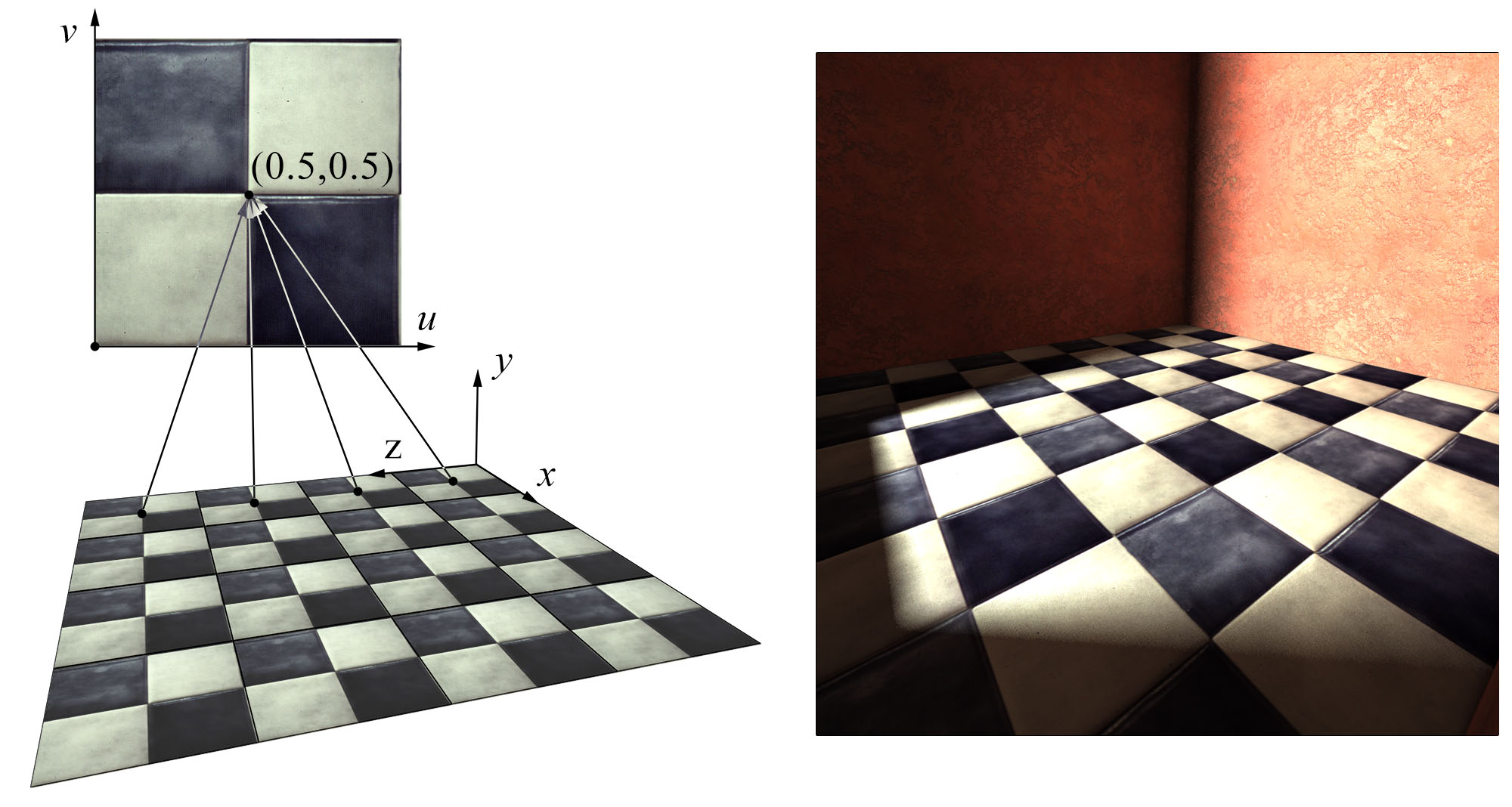 In the real world, surfaces very seldom exhibit a uniform appearance. Material properties, including albedo, Fresnel reflectance and roughness, vary across the object and the resulting appearance must be modeled in the virtual world, using computer graphics. Material properties can be assigned to vertices of polygons or entire clusters of geometric primitives and accessed via a shading algorithm to obtain the shading parameters and perform a local shading computation. Unfortunately, this primitive-dependent variation of the material properties over the surface of an object is very unlikely to occur in a real environment. In practice, on every surface, from the most dull and uninteresting real objects to the most intricate ones, one can detect small imperfections, geometric details, patterns or variations in the material consistency. These variations are perceived by the human eye and help us identify objects and materials and determine the physical qualities of the various media. It is often possible to represent the apparent discontinuities or transitions of the material properties as changes in the surface structure and vertex properties. This might even be an efficient modeling approach in the case of plain and well-defined patterns, as is the case in the first two insets of the following figure. In this particular example, a planar polygon is split at the boundaries of an A-shaped embedded pattern of a different color than the rest of the surface. But what if the desired pattern is more irregular and complex, as is the case of the material of the surface in the third inset? Clearly we need a different approach to modify the local material behavior across a polygonal or otherwise defined surface.