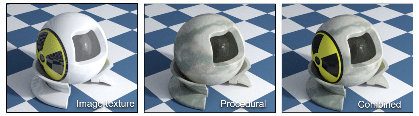 Procedural texturing has been extensively used in cinematic computer graphics, often combined with texture images. They are also particularly useful in the texture creation pipeline, to compose new texture images.
