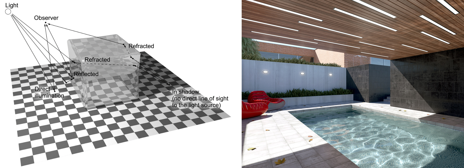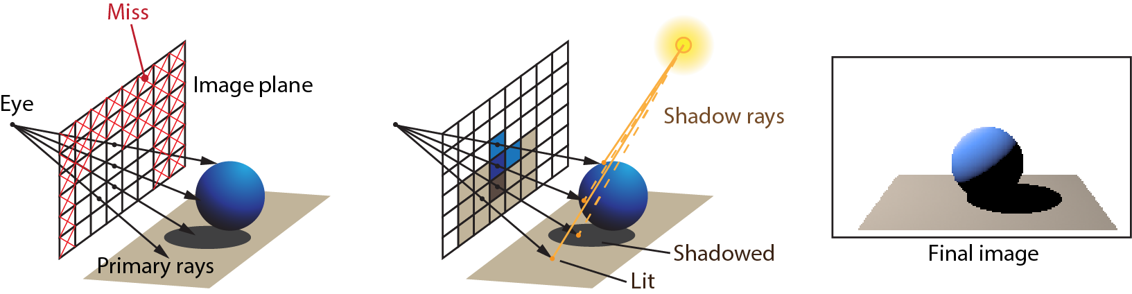 Rasterization-based rendering in its pure form disassociates the color and shading of a particular surface area from the existence of other objects in the same environment. Shadows, reflected and refracted light on surfaces, need to be simulated or approximated separately and fused as color information in the final composition rendering pass. Ray tracing, on the other hand, integrates all calculations that involve the scattering of light in one single and elegant recursive algorithm.