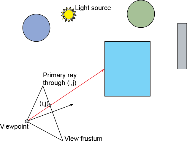 But let us first examine a simple replacement image synthesizer for the rasterization pipeline. We need to construct at least one ray per frame buffer pixel, starting from the center of projection and passing through a point on the image plane within the area of effect of each frame buffer pixel. For a single ray per pixel, typically the center of each pixel on the raster grid is chosen. The rays are generally defined in world space coordinates, since ECS or clip space coordinates make no sense and provide no benefit as a common reference frame in ray tracing. With no other provision in place, each ray is then tested for intersection with all primitives of all objects and for each valid intersection with a primitive, the hit location is examined to check whether this is the closest one to the origin discovered so far, or not. If the current hit point is the closest one so far, its attributes replace any other hit point data maintained so far for this ray. When no other intersections exist for a particular ray, the closest hit data (if any) are used for computing the local shading and the resulting color is registered on the frame buffer pixel that corresponds to the ray.