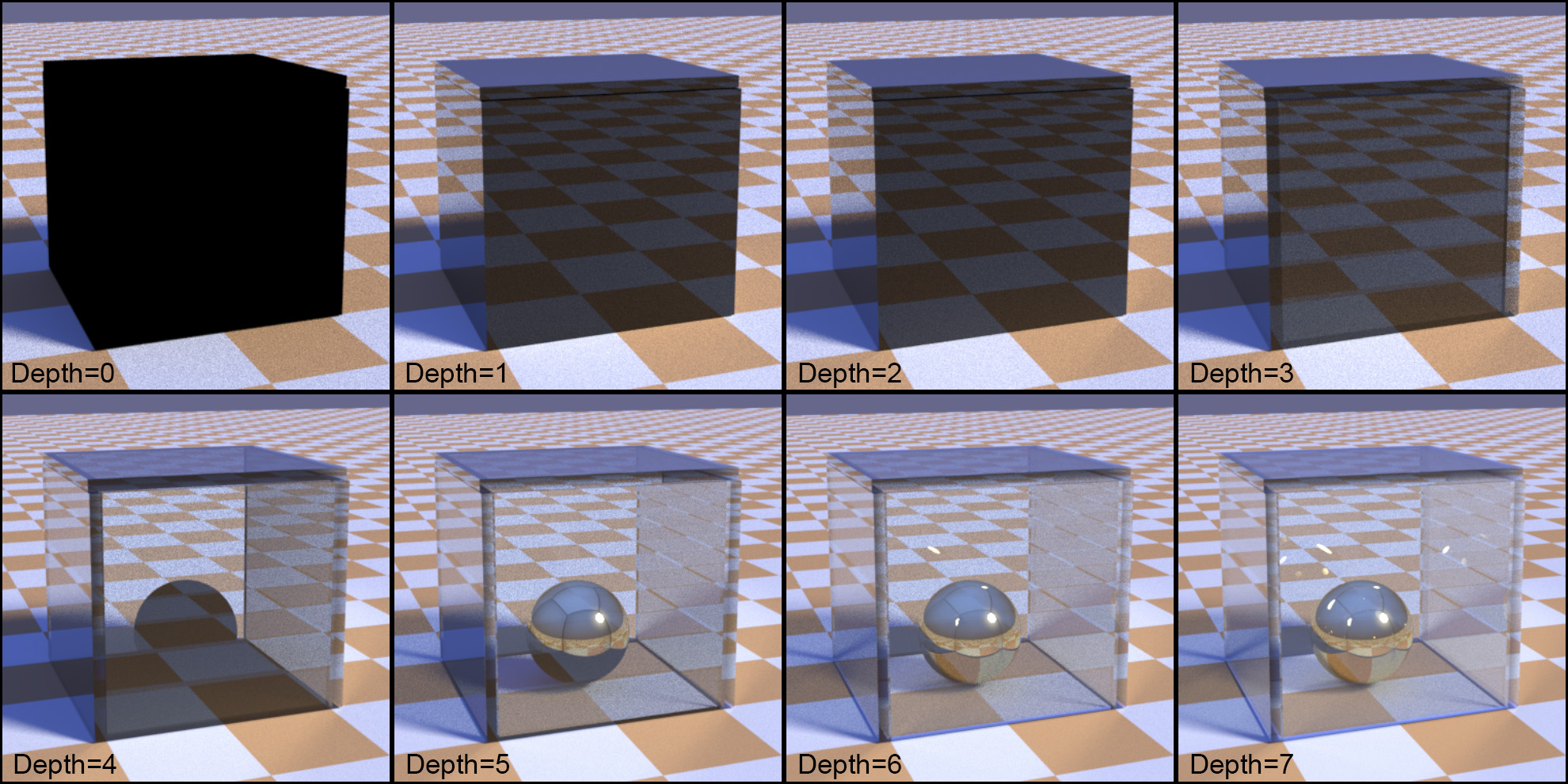 The depth of the recursion, i.e., how many times new rays are spawned, is controlled primarily by two factors: First, if the ray hits a surface with no transparency or mirror-like finish, no new rays are generated. Second, to prevent an uncontrollable spawning of rays in highly reflective or transparent environments, a maximum ray-tracing depth is usually defined. The following figure shows a comparison between renderings with a different maximum ray-tracing depth. Early ray pruning results in very wrong images for certain scenes. In this particular example, a polished sphere is placed inside a glass case. This particular ray tracing implementation performs a local illumination evaluation only on non mirror-like surfaces (which is typical). With few recursive steps, shadow rays from surface layers nested deep into the transparent geometry fail to reach the light source (here the sky dome), resulting in under-illuminated areas. From a maximum depth of 6 and above, the image begins to look plausible, despite the fact that subtle effects are still missing (e.g. see the secondary reflections of the metallic ball on the inside of the case in the transition from depth 6 to depth 7).