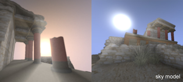 EaZD provides a custom empirical sky illumination model. The user declares which light source is the sun and computes the sky dome illumination according to the light's position (see also the scene graph node description). The model is not physically-based but it is very fast to compute. To further increase realism, the sun can be rendererd as volumetric light, casting correct light shafts by ray marching (with shadows). The number of samples along each ray is adjustable.