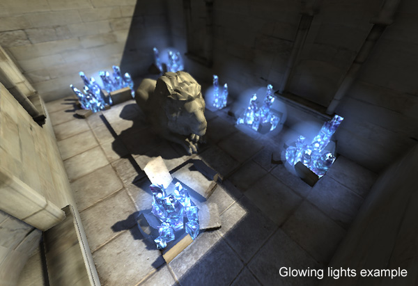 It adds a light source to the scene. The light source can be manipulated like any other node, including activation/deactivation and transformations. The light sources can be point lights, area lights (point lights with a non-zero radius) and spot lights, with or without attenuation or shadows. Lights also have a range of effect (and a near range for defining the closest-to-light distance for the shadow map) as well as an RGB color value which can be set to more than (1,1,1). Internally, illumination can withstand a 200% overexposure without being saturated, although the final result depends on the output buffer color accuracy. Shadows are enabled individually for each light source. |