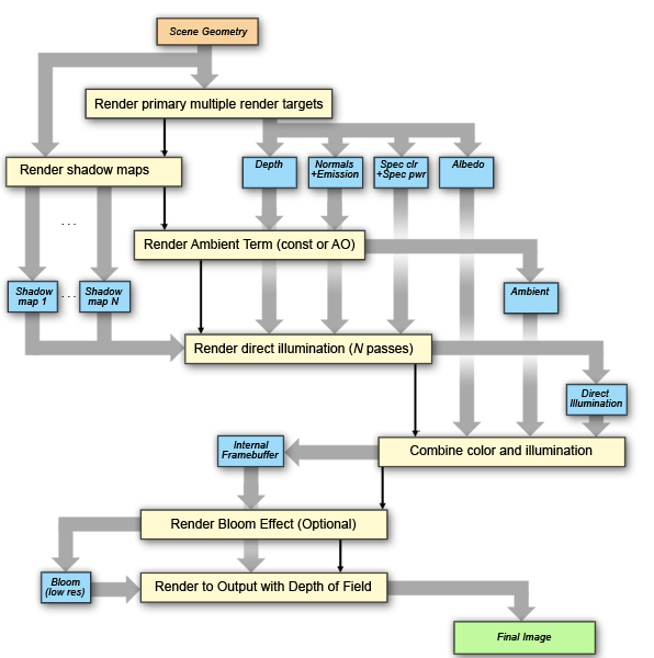 The data flow diagram of the various stages of the deferred renderer are presented in the following schematic: