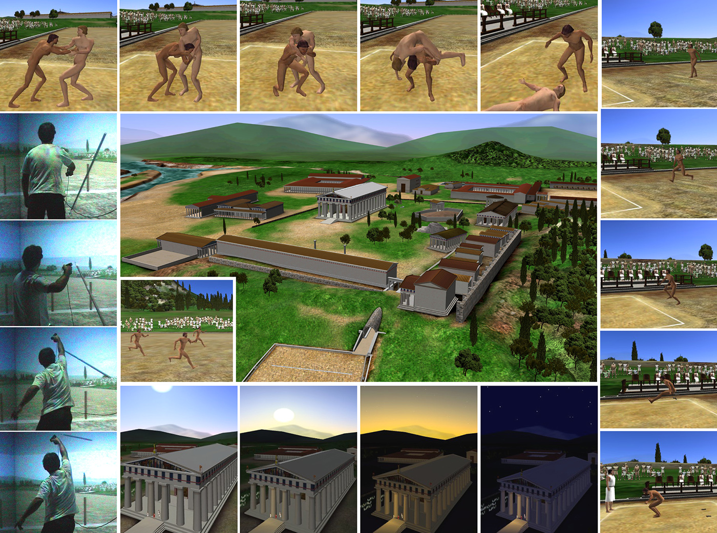 Screenshots and live capture from the production "A Walk through Ancient Olympia". The undertaking of the 28th Summer Olympiad by Athens, the capital city of Greece, has spurred an increased interest for shows and complementary edutainment contributions to the games themselves. The Foundation of the Hellenic World (FHW) has prepared a series of thematic productions related to ancient Olympia and the Olympic Games, culminating with the highly interactive and accurate representation of ancient Olympia and the pentathlon (running, long jump, javelin, discus throwing and wrestling), whose final version was released just before the beginning of the Olympic Games. The high demand for interactive and entertaining productions, apart from simple walkthrough applications, however eye-catching, has driven the virtual reality team of the FHW to pursue a role-playing active interaction model different from the classic navigator/inspector one. In the VR production "A Walk through Ancient Olympia", the user, apart from visiting the historical site, learns about the ancient games themselves by interacting with athletes in the ancient game of pentathlon.