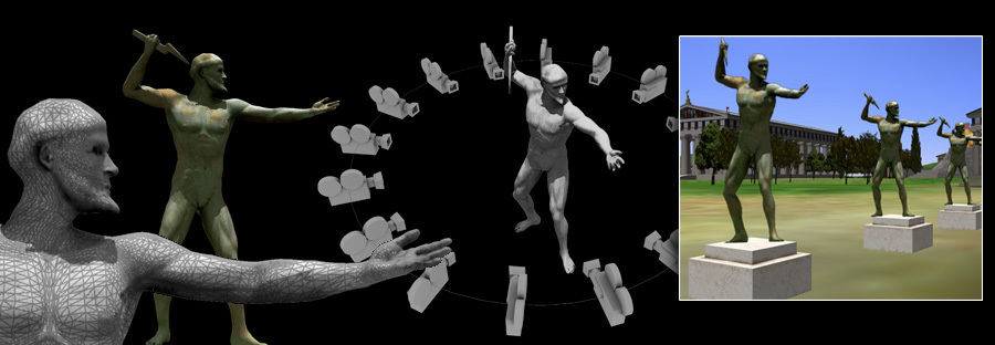 The figure shows the statue of Zeus, modeled in 3D Studio MAX and rendered using multi-view IBR. Later, the IBR statue was replaced with actual geometry, as the upgraded hardware would allow a higher polygon budget. -