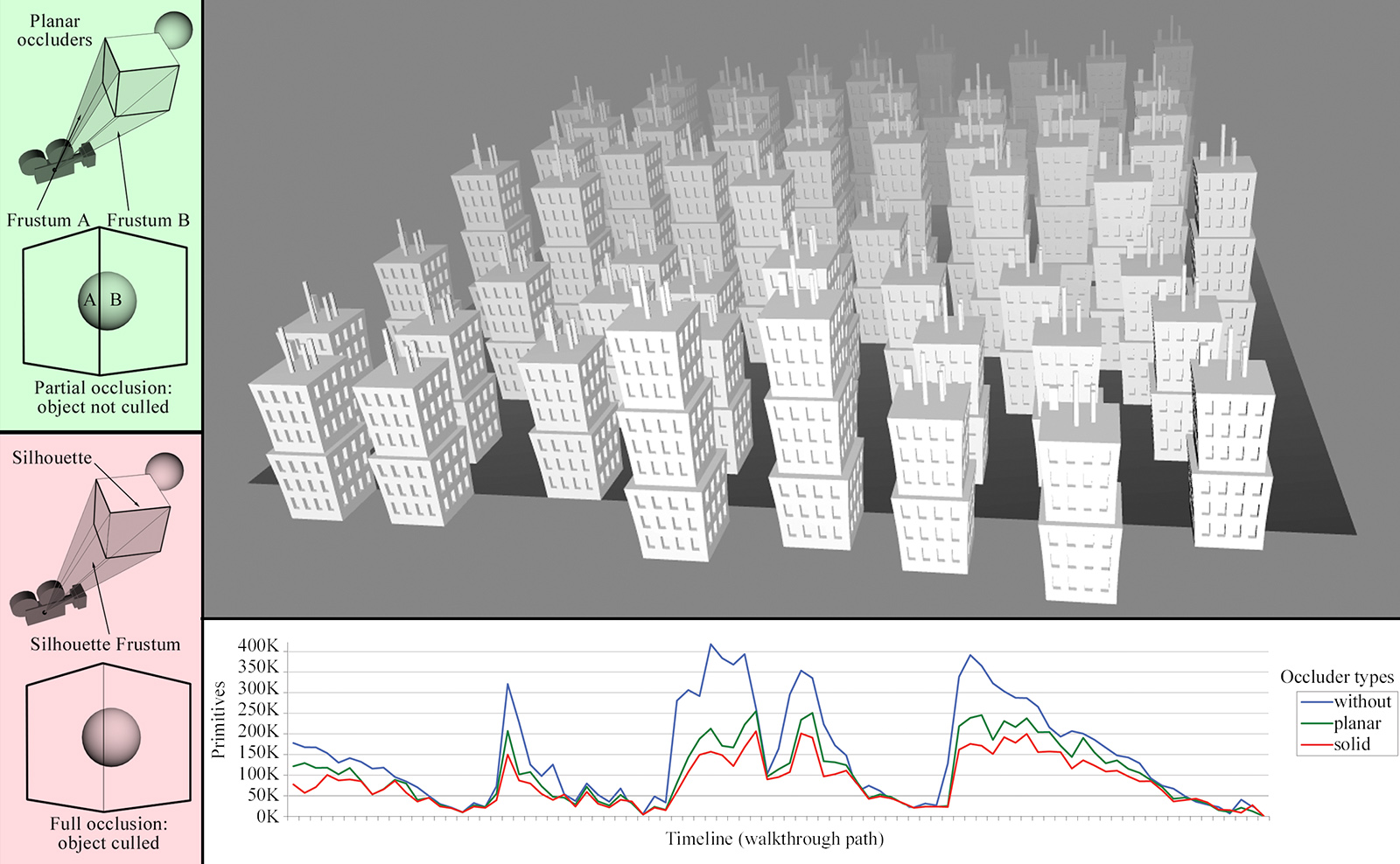 In occlusion culling, geometry that is hidden behind objects closer to the camera point is discarded before being subject to depth sorting algorithms, although this geometry may pass the other two culling tests. Most occlusion culling methods use planar occluders and their projections on the viewing plane. These planar occluders are often the polygons of the blocking geometry. An extension to the popular shadow frustum culling algorithm has been investigated, which takes into account the fact that many planar occluders can be grouped into compound convex solids, which in turn can provide fewer and larger culling frusta and therefore more efficient elimination of hidden geometry. This approach provides better occlusion at a significantly reduced cost due to fewer occlusion tests. The figure below demonstrates the principle of the solid occluders method (G. Papaioannou, A. Gaitatzes, D. Christopoulos, Efficient Occlusion Culling using Solid Occluders. Proceedings of the 14-th International Conference in Central Europe on Computer Graphics, Visualization and Computer Vision (WSCG), 2006).