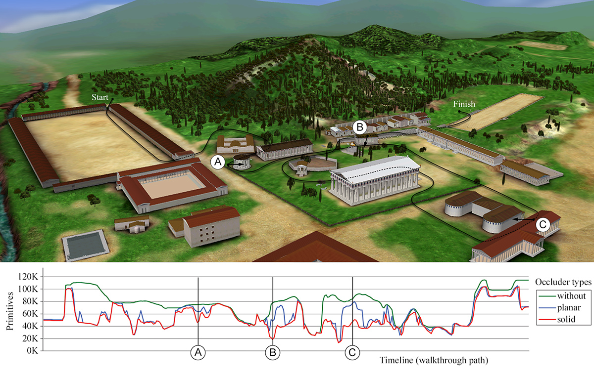 Another problem that we came across when deploying the production on the SGI Onyx-driven CAVE, was that performance was really coming down to a crawl at certain locations, due to heavy overdraw. This is when we had to investigate a solution with regard to occlusion culling. Existing methods mostly relied on the concept of portals or planar occluders. Unfortunately, for an open environment such as Ancient Olympia, most algorithms either failed to provide adequate culling or performed well but with a significant performance hit, thus countering the benefits of occlusion culling.